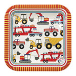 Fabulous paper plate for a party of little mechanics featuring a host of Big Rig machines including diggers, tippers and car transporters. The plate is bordered with a colourful striped pattern.